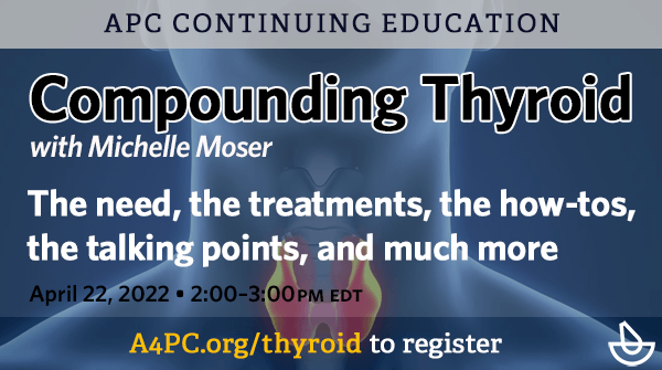 APC is offering a free hour-long CE webinar, "Compounded Thyroid: How to Start the Conversation With Your Provider" taught by Michelle Moser, RPh, owner of Maker’s Compounding Pharmacy in Mount Vernon, Wash.