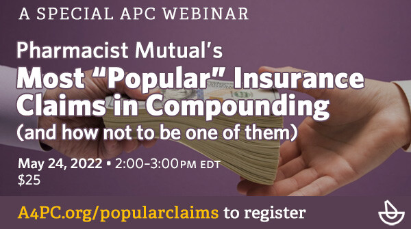 Please join us for a webinar, Pharmacists Mutual’s Most "Popular" Insurance Claims in Compounding (and how not to be one of them) this coming Tuesday, May 24 from 2:00pm–3:00pm EDT.