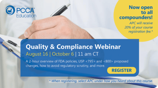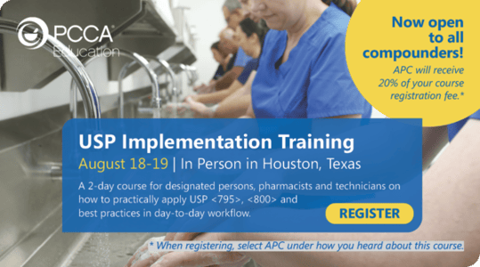 This means that any compounding pharmacist or technician can now attend PCCA’s in-person USP Implementation Training ($1,595.00 per person) and virtual Quality & Compliance Webinar ($95.00 per person). Plus, APC will receive 20 percent of the course registration fee for each referral that results in registration.