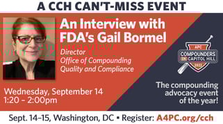 FDA’s director of the Office of Compounding Quality and Compliance, Gail Bormel, has accepted APC’s invitation to attend Compounders on Capitol Hill. She’ll participate in a special interview-style session with APC CEO Scott Brunner on Wednesday afternoon, September 14, prior to Capitol Hill visits the next day.