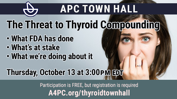 “FDA says in the letter that it considers thyroid USP to be a biologic on the basis of a component in the product, thyroglobulin, that is not even an active ingredient of the medication,” said APC President Dave Miller. “Yet neither thyroid USP nor thyroglobulin are listed in FDA’s Purple Book. In addition, the commercially available thyroid USP drug products make no mention of thyroglobulin on their products’ inserts or labeling. If thyroglobulin may cause the patient harm FDA says it does, why is it not even mentioned on those inserts or labels?”