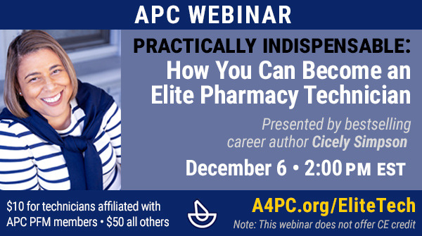 Join us on December 6 at 2pm ET for Practically Indispensable: How You Can Become an Elite Pharmacy Technician. Presenter Cicely Simpson will share tips and techniques you can employ to grow your influence, enhance your value to your pharmacy team, and turn that “just a technician” job into a rewarding career.