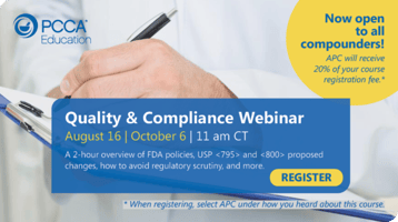 Be aware: FDA has issued a number of 483s related to the water used in nonsterile compounding. Water for nonsterile compounds needs to be USP-grade purified water. If you use a water purification system to produce “purified water” for your nonsterile compounds, make sure to test the water produced for compliance with the USP Purified Water monograph. This includes testing for Total Organic Carbon (TOC), conductivity, and microbial content. If you are not or cannot test the water to ensure it falls within appropriate parameters, discontinue the use of the water system and buy USP grade purified water instead.