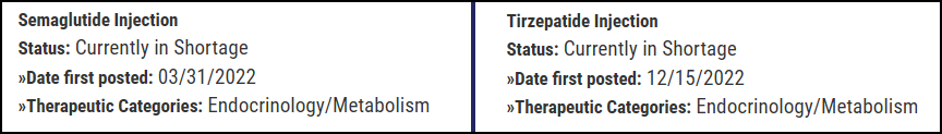 The shortage list maintained by the American Society of Health System Pharmacists, considered to be a much more real-time indicator of drug shortages, continues to list tirzepatide injection in shortage.